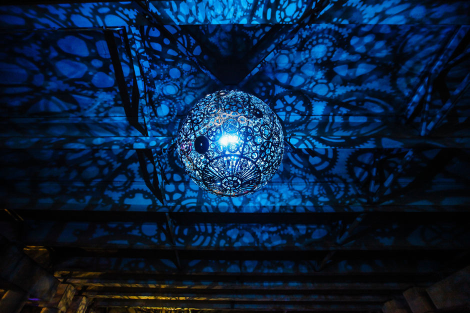 Each globe casts sharply detailed shadows, painting the underpass with complex color patterns and ethereal lighting, ultimately refashioning the space into a majestic ballroom-cum-shadow theater. Melding grandeur with a sense of neighborhood rejuvenation, the sculptures weld recycled bike parts into refined forms.
