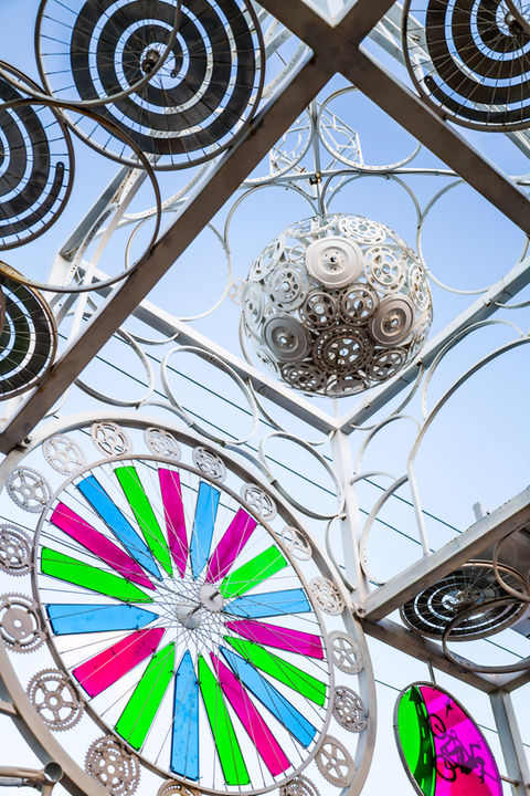 Bike Church references the rich cycling culture found in Tucson through it's recycled bike parts and acts as a communal memorial to cyclists. The custom designed 'stained glass' windows cast vibrant colors onto the white structure during the day and at night they create a glowing beacon in the landscape. Bike part chimes hang like organ pipes that visitors or the wind can play and fill the surrounding area with sound. The piece has become a landmark and gateway to the neighborhood, becoming a place for sorrow and joy; mourners regularly leave flowers for fallen cyclists and at least one couple has been married inside the piece. Bike Church is an aggregate that the public has enlivened by constantly adding to the artwork and using it in new unexpected ways.