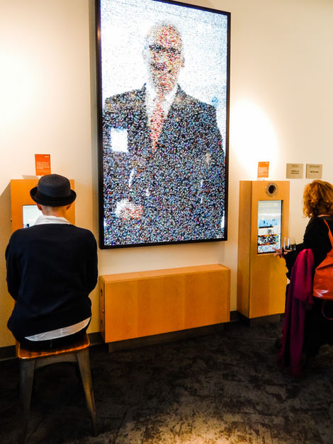 Mosaic Faces allows visitors to create a unique mosaic of their own image. Visitors start by taking a picture of their face through one of the kiosks on either side. The exhibit then generates a version of their image made up of hundreds of other photos. Visitors can select from multiple themes when creating their mosaic. When the mosaic has been completed visitors have the option to send their image to friends via email. Mosaic Faces demonstrates how our eyes see different images and colors when playing with relative image scale.