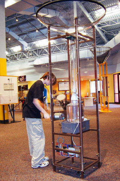 With the Ping Pong Launcher, visitors turn a crank to send electricity through water and send ping pong balls flying high into the air. The electric current breaks the water molecules apart into hydrogen and oxygen gases which bubble up and gather below a ping pong ball. After about 30 seconds of producing gas, the visitor can press a button to ignite the hydrogen-oxygen mixture. Bang! Instantly, the hydrogen and oxygen recombine to form water, producing heat and a flash of light as they do. The ping pong ball flies up to the top of the tube while the water falls back into the tank. The entire unit is safe, self-contained, and clearly visible.