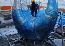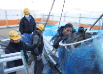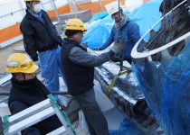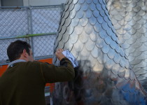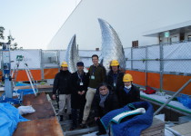 This week Joe installed piole Kabuto on the rooftop of a luxury shopping mall in Himeji Japan. He was assisted by architect Daisuke Tenagaki of Envrand Ltd and engineer Keizo Matsuda and his team from Inter-L Co. Ltd. The sculpture is comprised of more than 1330 individual stainless steel scales, each one unique, designed using Rhino 3D modeling software, cut by waterjet and hammered on our 19th century power hammer.