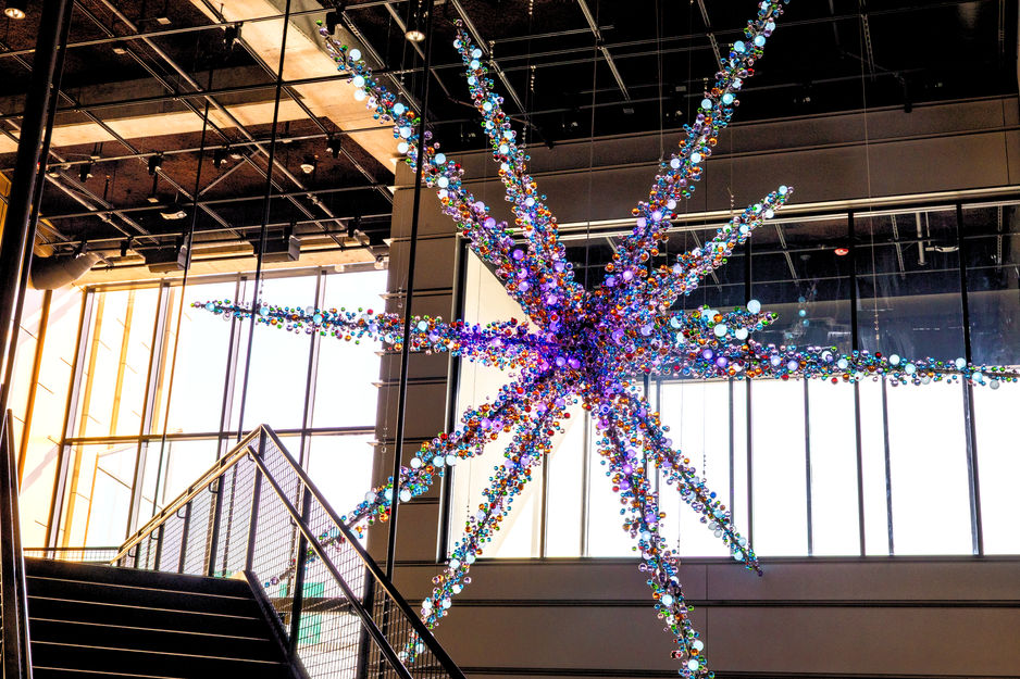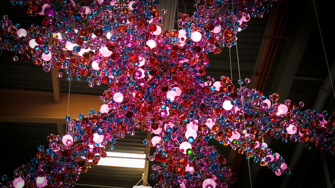 Power of Pop is located in the Oklahoma Historical Society's new museum, OKPOP, that shares the state’s pop culture artifacts and collections. The sculpture draws its inspiration and color palette from comic books and concert posters. Thousands of handmade glass spheres evoke the superimposed ink dots that the Ben-Day printing process employed to create color images in vintage comic books. The overall shape is a multi-directional crossroads of culture suspended in the atrium where it is visible from outside the building and from many points within. Computer-controlled LED lighting within the glass spheres creates animated sequences of light moving through the sculpture and radiating outwards like explosions of pop culture.