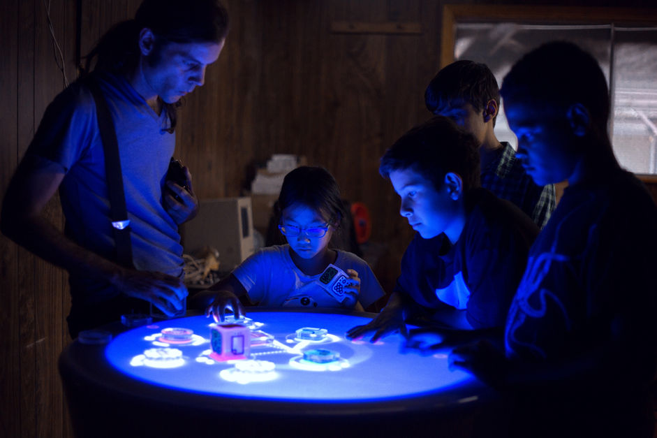 Its multi-user capability allows several players to use the installation simultaneously and promotes collaborative compositions. A visual display of the tabletop is projected onto the white wall next to the exhibit so other visitors of the museum are able to watch the action from a distance. Reactable is accessible to all ages.