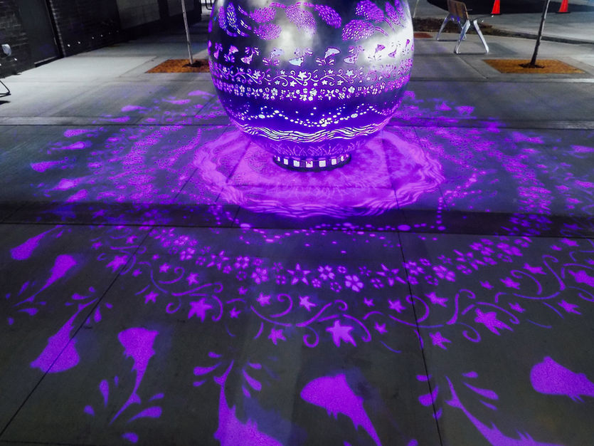 Water is Life is an outdoor sculpture that celebrates the essential role water has played in the history of Broomfield, CO. From a distance, the sculpture is a large water droplet made of marine-grade stainless steel with a dull rubbed finish. Cutouts on the surface of the droplet depict the front range, groundwater, water flowing on the surface, snowflakes and both native and cultivated local plants that rely on water. As evening comes every day, the sculpture is lit from within by a point-source light fixture that casts illuminated shadows on the ground nearby. A button allows visitors to change the color of the piece.